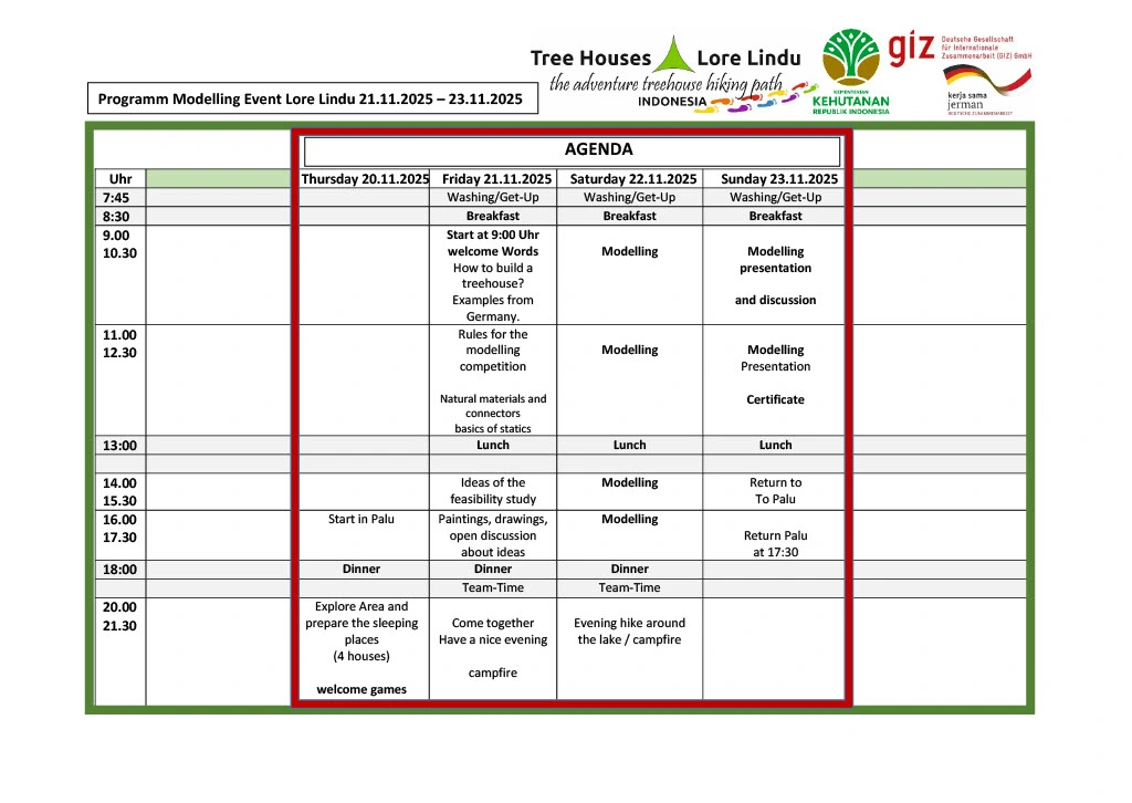 During this three-day workshop, participants will design and model ideas for an eco-friendly treehouse trail, combining traditional materials, structural knowledge, and creative concepts. The event highlights how environmental protection and community participation can create new perspectives for sustainable tourism in Central Sulawesi.